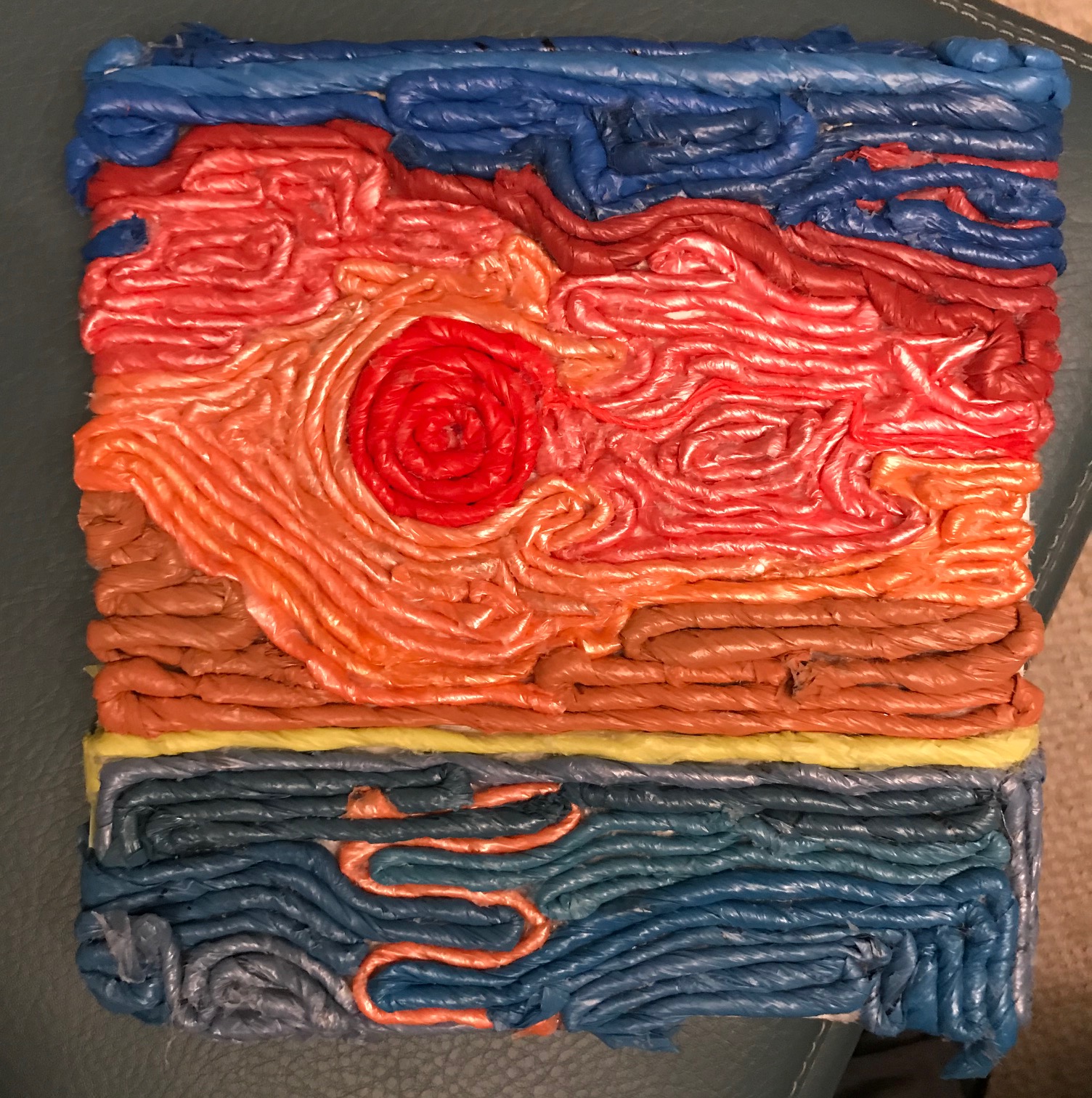 I have a deep need to make some sort of impact on the environment in my art if I can. So many art supplies only contribute to trash. So, I began to work with plastic bags. There’s still a lot I want to do with this medium, but these are the works I’ve done so far.