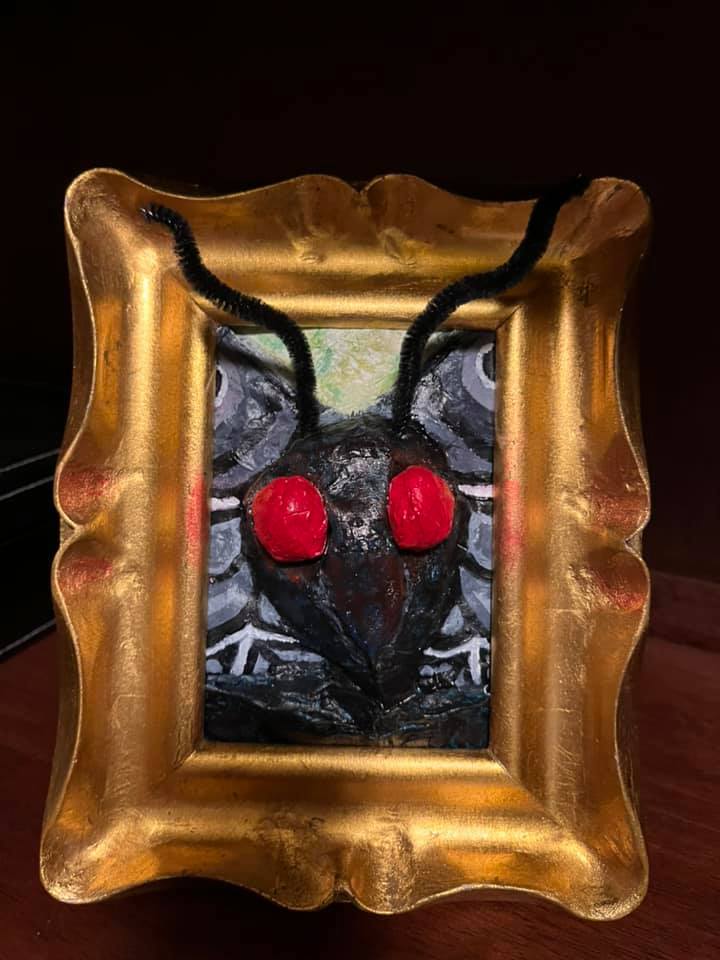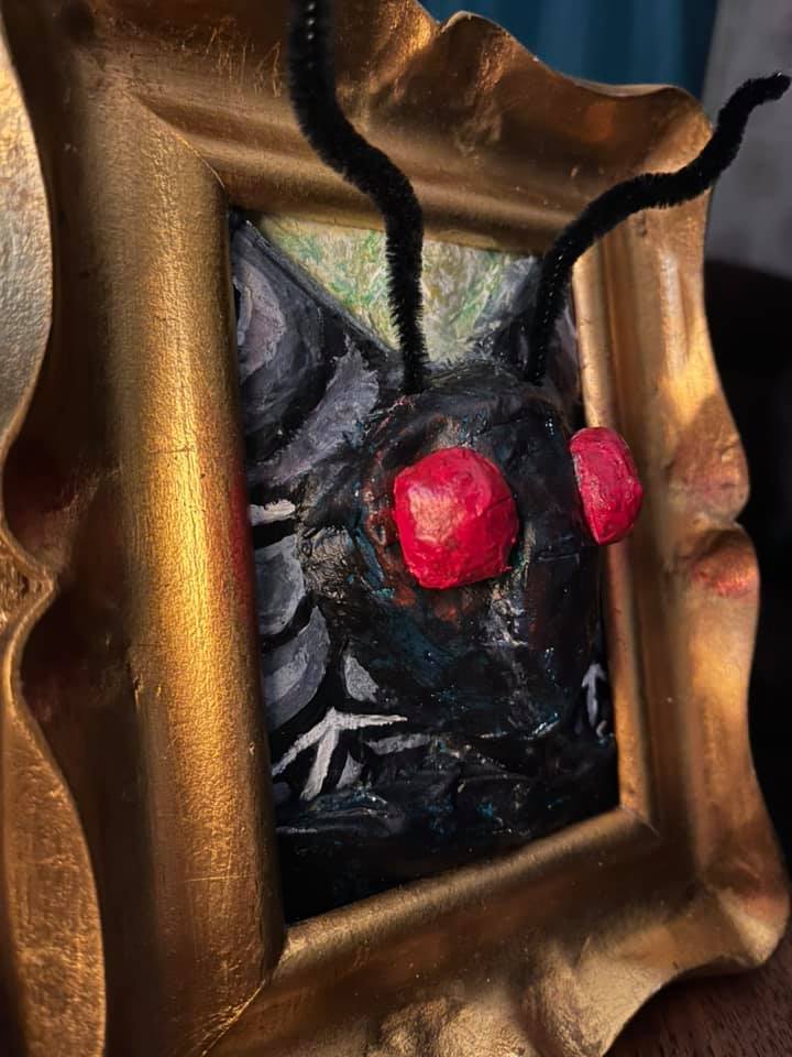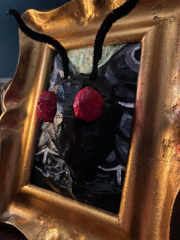 I had this desire to 1) work with paper mache and 2) teach my kids what paper mache was. And I had this vision of 3D Cryptid Portraits, how a frame cannot contain their effect, and the eerieness of their visages and how they would prefer to be portrayed poking out from a wall. Further, I wanted to use mostly recycled materials – the frames come from thrift shops or giveaways, the paper from advertisement flyers I can’t get them to stop sending me in the mail.
